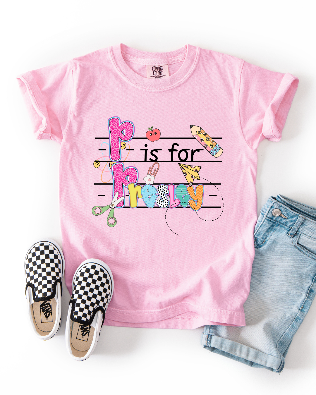 Youth tee with screen printed design. Clothing fits true to size. The final product will vary in letter colouring/patterns. If you require a proof, please select that option. COLOUR PICTURED IS BLOSSOM.