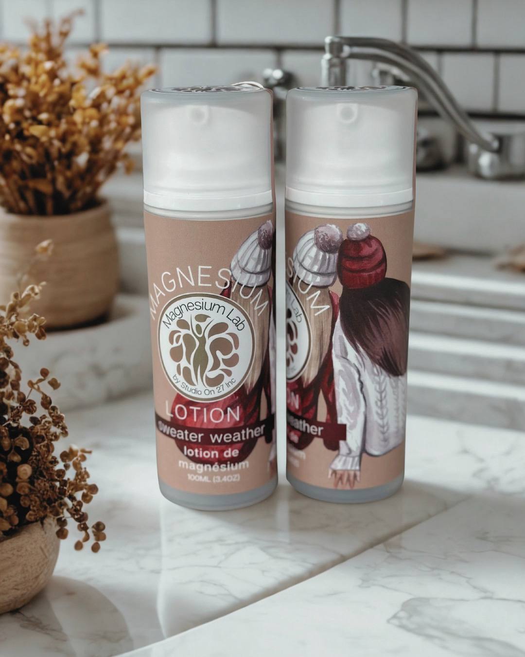 Boasting the same powerful double strength, magnesium chloride formulation as all the other lotions in our lineup that you love, Sweater Weather brings you a new and exciting blend with top notes of Autumn Leaves, middle notes of Sweet Spearmint, Eucalyptus, Juniper Berry and bottom notes of Sage, Woods